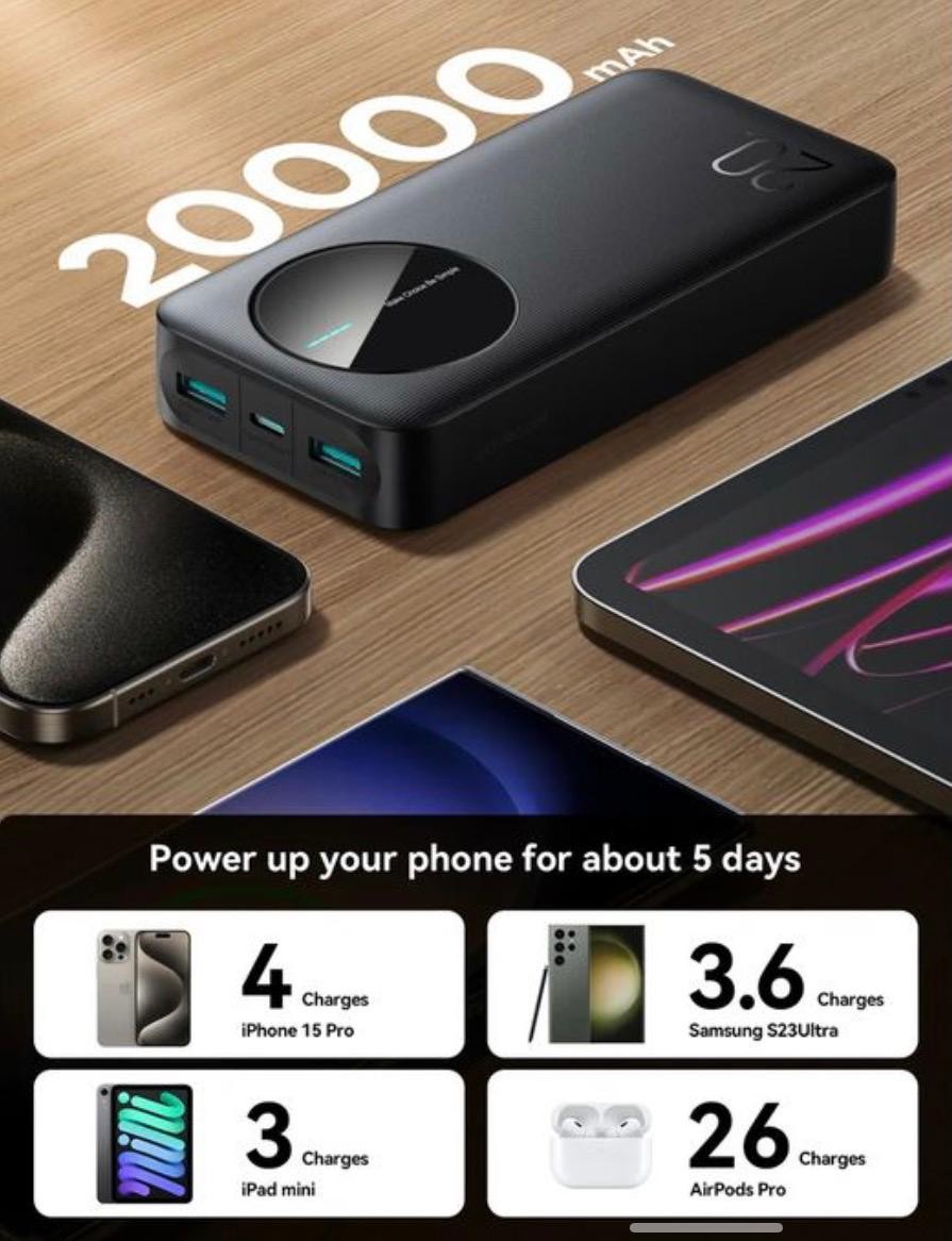 • سعة كبيرة وشحن سريع: بطارية بسعة 20,000 مللي أمبير في الساعة تكفي لشحن الهواتف الذكية والأجهزة اللوحية عدة مرات، مع تقنيات شحن سريع فائقة تصل إلى 65 واط، 30 واط، أو 22.5 واط.